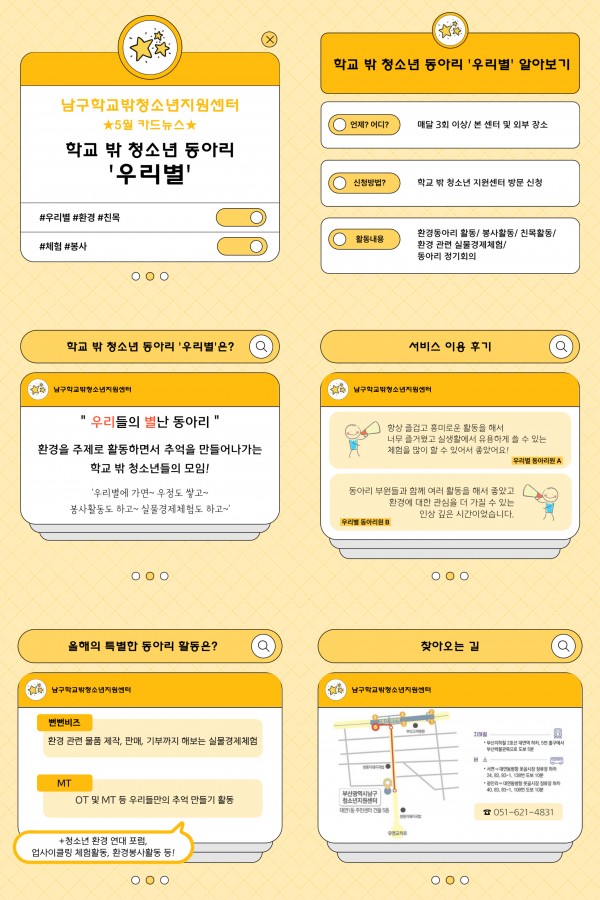 학교밖) 5월 카드뉴스 페이지 정보 작성자 최고관리자 작성일24-05-14 13:59 조회122회 댓글0건 이전글 다음글 답변 목록 본문 남구학교밖청소년지원센터 5월 카드뉴스입니다! 문의사항은 051-621-4831로 전화주세요:) 댓글목록 등록된 댓글이 없습니다. 이전글 다음글 답변 목록