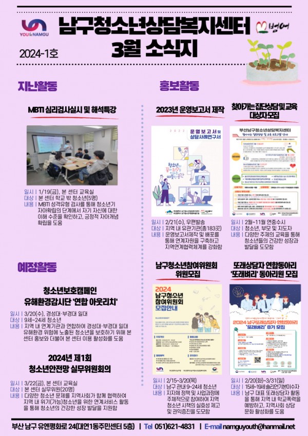 3월 소식지 페이지 정보 작성자 최고관리자 작성일24-03-11 17:04 조회121회 댓글0건 이전글 다음글 답변 목록 본문 남구청소년상담복지센터·남구학교밖청소년지원센터 3월 소식입니다:) 댓글목록 등록된 댓글이 없습니다. 이전글 다음글 답변 목록