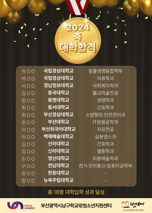 학교밖) 2024학년도 대학합격 페이지 정보 작성자 최고관리자 작성일24-04-01 13:57 조회164회 댓글0건 이전글 다음글 답변 목록 본문 대학에 합격한 16명의 학교 밖 청소년들을 진심으로 축하합니다. 항상 응원하겠습니다! 댓글목록 등록된 댓글이 없습니다. 이전글 다음글 답변 목록