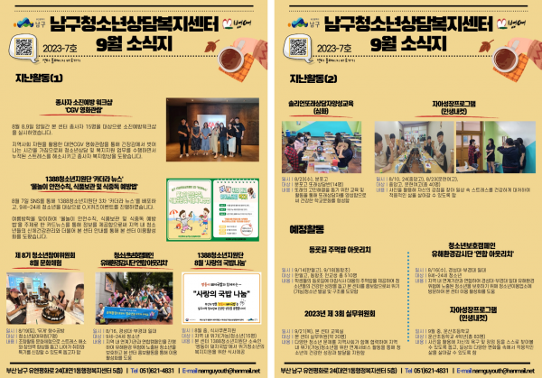 9월 소식지 페이지 정보 작성자 최고관리자 작성일23-09-14 16:47 조회162회 댓글0건 이전글 다음글 답변 목록 본문 남구청소년상담복지센터·남구학교밖청소년지원센터 9월 소식입니다:) 댓글목록 등록된 댓글이 없습니다. 이전글 다음글 답변 목록
