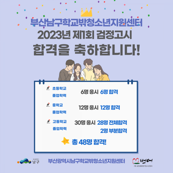 2023년 1회 검정고시에 합격한 남구학교밖청소년지원센터 소속 청소년들을 진심으로 축하합니다~