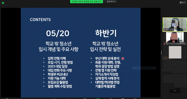 ❍ 내용 : 대학진학을 희망하는 본 센터 소속 청소년 9명을 대상으로 대학입시설명회를 진행하였습니다.