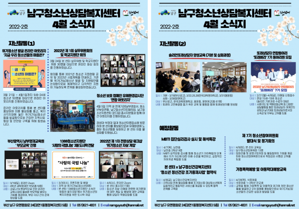 4월 소식지 페이지 정보 작성자 최고관리자 작성일22-04-19 11:37 조회962회 댓글0건 이전글 다음글 답변 목록 본문 남구청소년상담복지센터·남구꿈드림 4월 소식입니다:) 댓글목록 등록된 댓글이 없습니다. 이전글 다음글 답변 목록