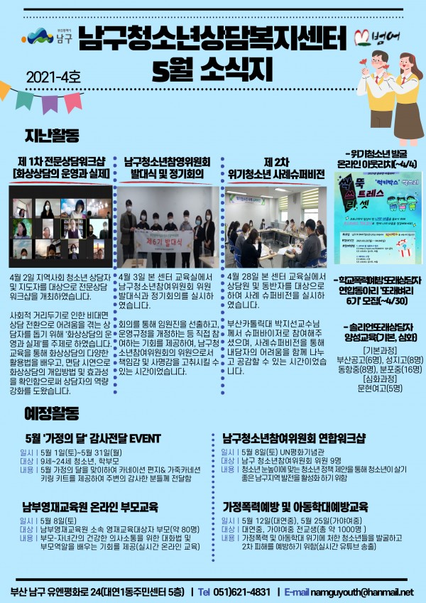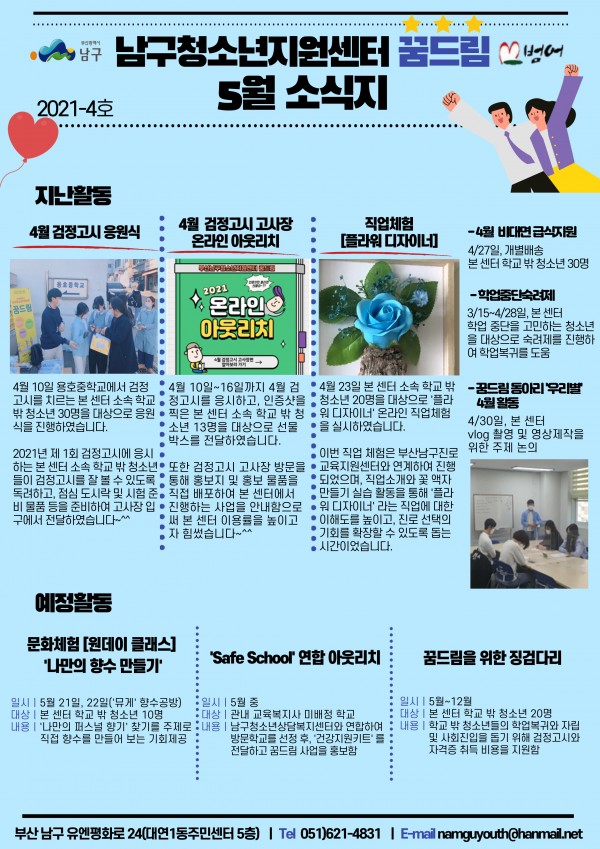 5월 소식지 페이지 정보 작성자 최고관리자 작성일21-07-01 10:56 조회2,199회 댓글0건 이전글 다음글 답변 목록 본문 남구청소년상담복지센터, 꿈드림 5월소식입니다~^^ 댓글목록 등록된 댓글이 없습니다. 이전글 다음글 답변 목록