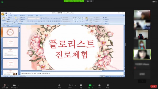 내용 : ZOOM프로그램을 활용한 비대면 직업체험(플라워 디자이너)을 진행하여 남구 꿈드림 학교 밖 친구들의 진로결정및 직업세계에 대한 이해를 도왔습니다.