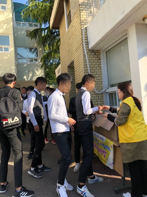 등교시간에 맞춰 찾아가는 아웃리치로 청소년의 건강한 아침을 위한 주먹밥을 배부함.