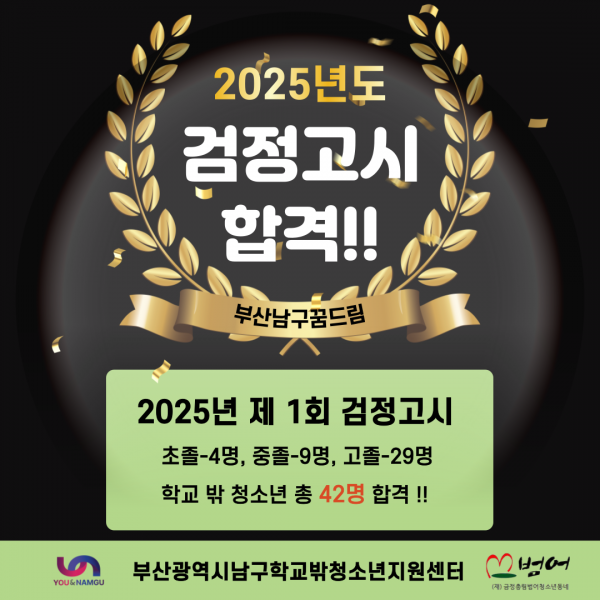 2025년 1차 검정고시에서 남구학교밖청소년지원센터 42명의 청소년들이 합격하였습니다 ~!