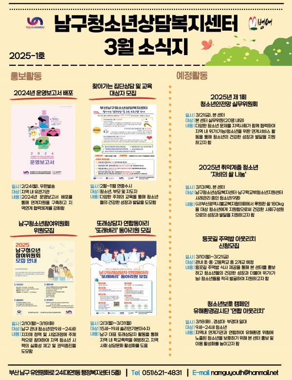 3월 소식지 페이지 정보 작성자 최고관리자 작성일25-03-07 14:40 조회68회 댓글0건 이전글 다음글 답변 목록 본문 남구청소년상담복지센터·남구학교밖청소년지원센터 3월 소식입니다:) 댓글목록 등록된 댓글이 없습니다. 이전글 다음글 답변 목록