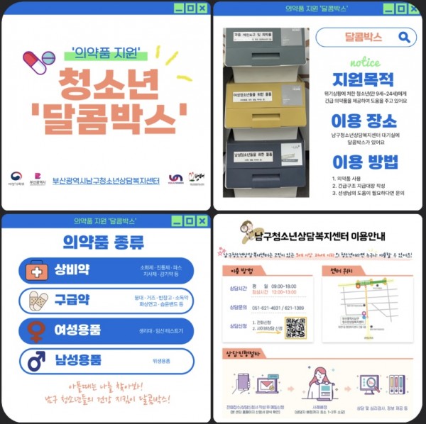 위기청소년 의약품 지원 '달콤박스' 카드뉴스 페이지 정보 작성자 최고관리자 작성일24-09-04 14:23 조회91회 댓글0건 이전글 다음글 답변 목록 본문 남구청소년상담복지센터는 의약품 지원을 위한 '달콤박스'가 있습니다~! 달콤박스 무엇인지에 대해서 알아볼까요? 댓글목록 등록된 댓글이 없습니다. 이전글 다음글 답변 목록