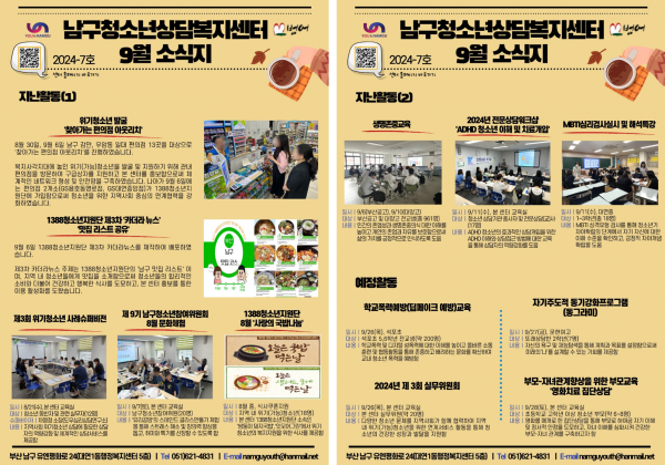 9월 소식지 페이지 정보 작성자 최고관리자 작성일24-09-11 18:57 조회137회 댓글0건 이전글 다음글 답변 목록 본문 남구청소년상담복지센터·남구학교밖청소년지원센터 9월 소식입니다:) 댓글목록 등록된 댓글이 없습니다. 이전글 다음글 답변 목록
