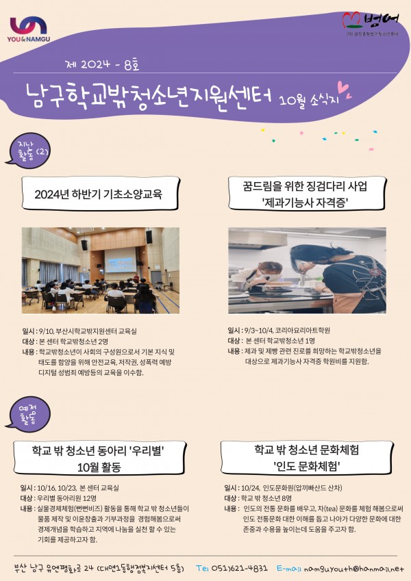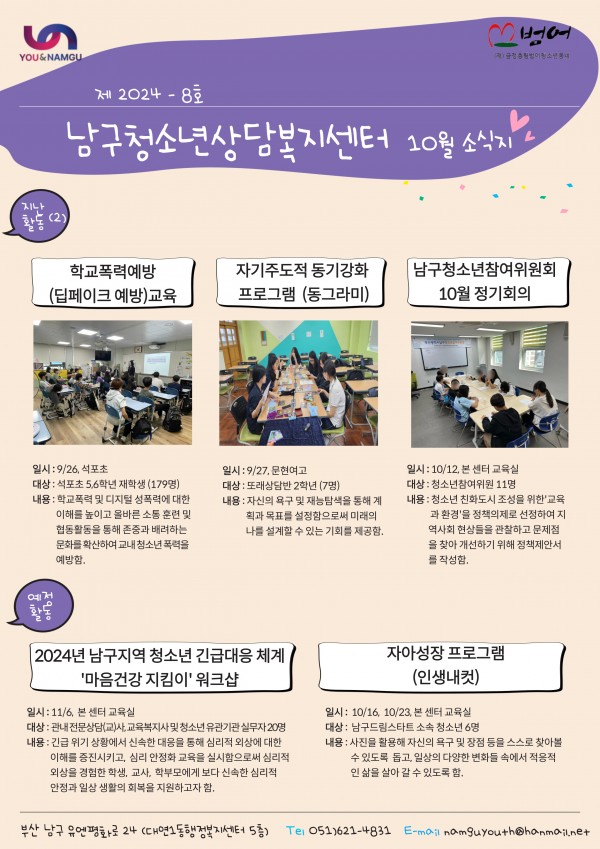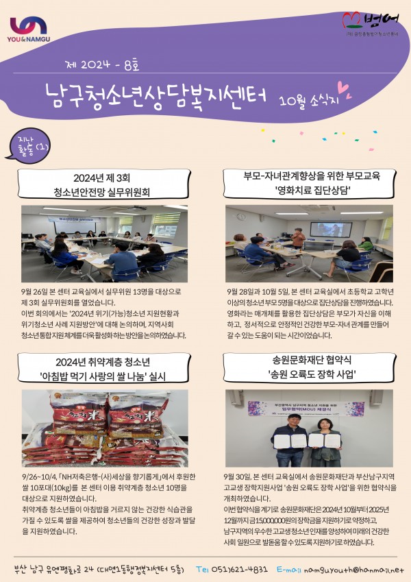 남구청소년상담복지센터&남구학교밖지원센터10월 소식지 페이지 정보 작성자 최고관리자 작성일24-10-17 13:28 조회88회 댓글0건 이전글 다음글 답변 목록 본문 남구청소년상담복지센터 및 남구학교밖지원센터 10월 소식지 입니다 댓글목록 등록된 댓글이 없습니다. 이전글 다음글 답변 목록