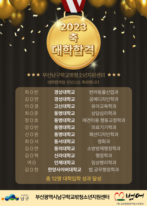 학교밖) 2023학년도 대학합격 페이지 정보 작성자 최고관리자 작성일23-03-02 10:16 조회697회 댓글0건 이전글 다음글 답변 목록 본문 대학에 합격한 12명의 학교 밖 청소년들을 진심으로 축하합니다. 항상 응원하겠습니다! 댓글목록 등록된 댓글이 없습니다. 이전글 다음글 답변 목록