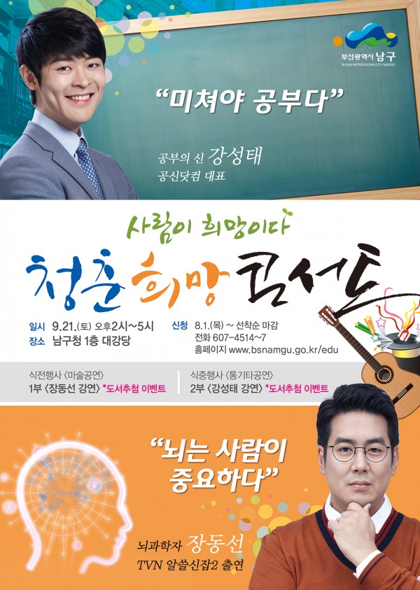 남구 평생학습센터에서 공부에 지친 학생들을 위한「청춘희망콘서트」응 아래와 같이 개최합니다.