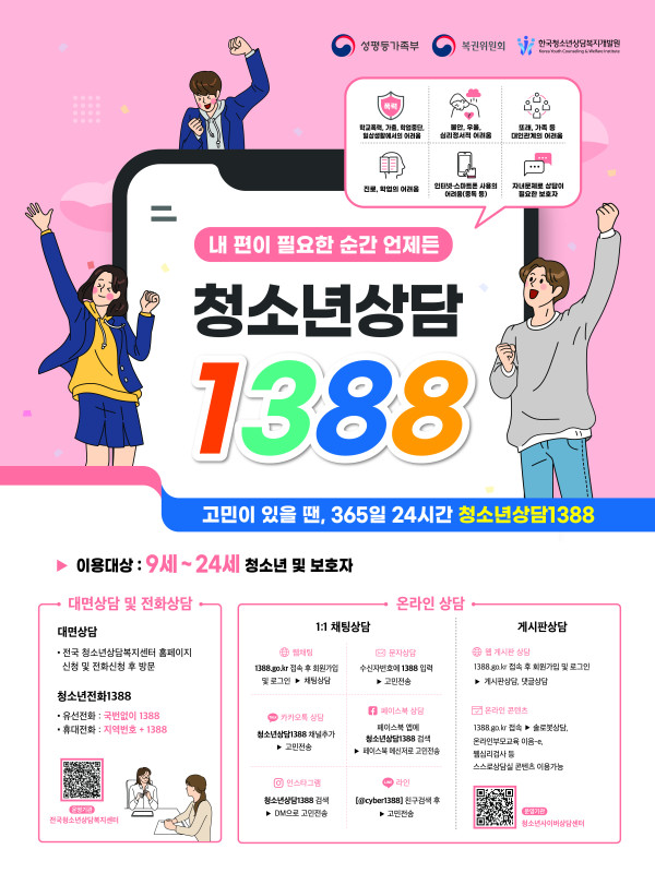 내용: 청소년의 일상적인 고민 상담부터 가출, 학업중단, 인터넷 중독 등 위기에 이르기까지 1388에 전화하시면 상담을
