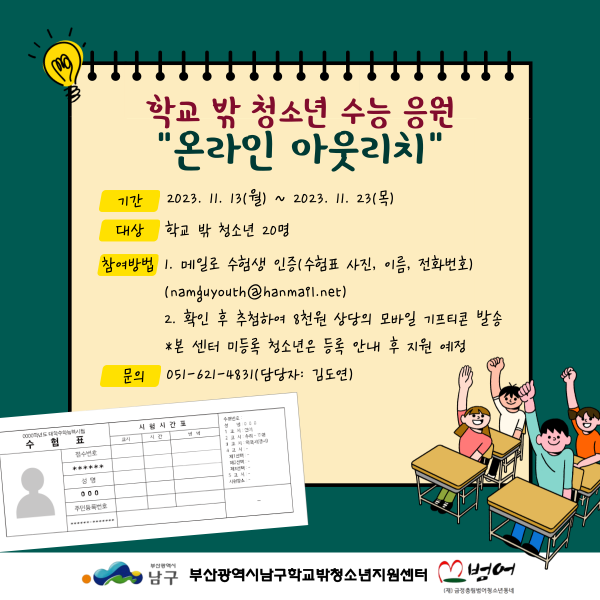 학교 밖 청소년 수능응원 온라인 아웃리치 페이지 정보 작성자 최고관리자 작성일23-11-10 10:11 조회284회 댓글0건 본문 학교 밖 청소년 수능 응원 온라인 아웃리치를 진행합니다! 많은 관심과 참여 부탁드립니다~ 이전글 다음글 목록
