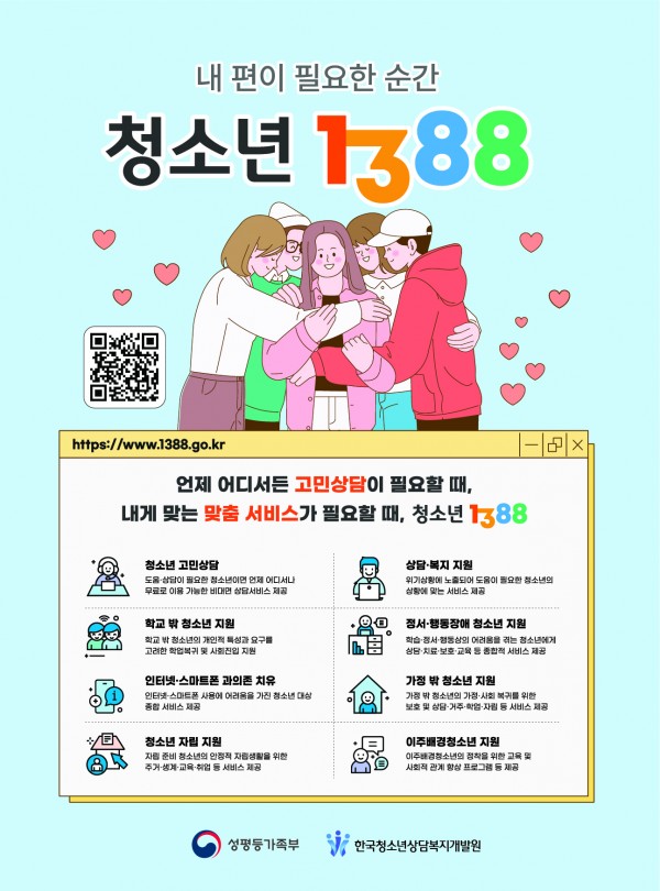 내용: 청소년의 일상적인 고민 상담부터 가출, 학업중단, 인터넷 중독 등 위기에 이르기까지 1388에 전화하시면 상담을