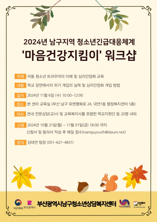 2024년 남구지역 청소년 긴급대응 체계 '마음건강지킴이' 워크샵을 개최합니다. 많은관심과 참여 부탁드립니다!