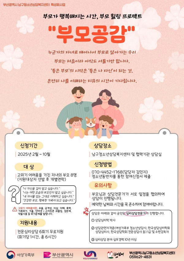 부모가 행복해지는 시간, 부모 힐링 프로젝트 부모 대상 전문상담지원사업 ’부모공감‘ 안내드립니다~^^