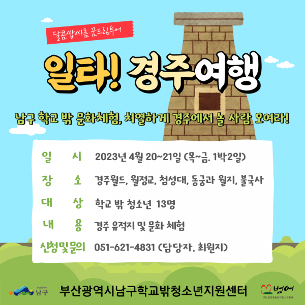 부산을 떠나 경주에서 학교밖 친구들, 쌤들과 즐거운 추억 만들 청소년들의 적극적인 참여 부탁드립니다~:)♥