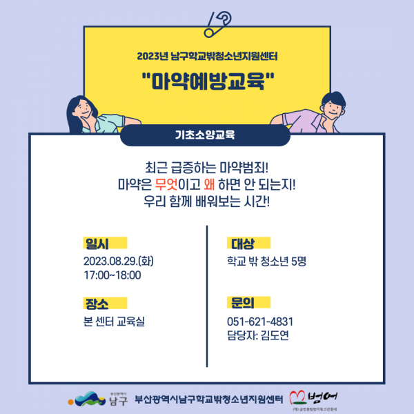 남구학교밖청소년지원센터 마약예방교육 참여 인원 모집 페이지 정보 작성자 최고관리자 작성일23-08-24 16:41 조회256회 댓글0건 첨부파일 학교 밖 청소년을 대상으로 마약예방교육을 실시할 예정입니다~ 많은 관심과 참여 부탁드립니다.^^ 일시 : 8월 29일(화) 17:00~18:00 장소 : 본 센터 교육실 인원 : 학교 밖 청소년 5명 문의 : 051-621-4831(김도연)