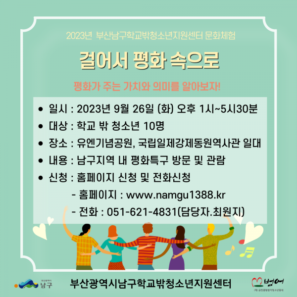 남구학교밖청소년지원센터 문화체험 '걸어서 평화 속으로' 참여자 모집