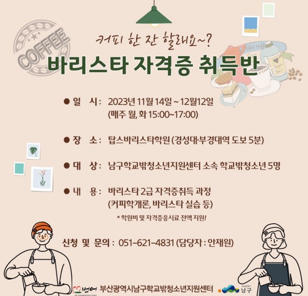 남구학교밖청소년지원센터 바리스타 자격증취득반 인원모집 페이지 정보 작성자 최고관리자 작성일23-11-07 11:54 조회220회 댓글0건 첨부파일 일시: 11/14~12/12, 매주 화,수 15:00~17:00 대상: 학교밖청소년 5명 문의: 051-621-4831(안재원) 많은 참여 바랍니다~^^