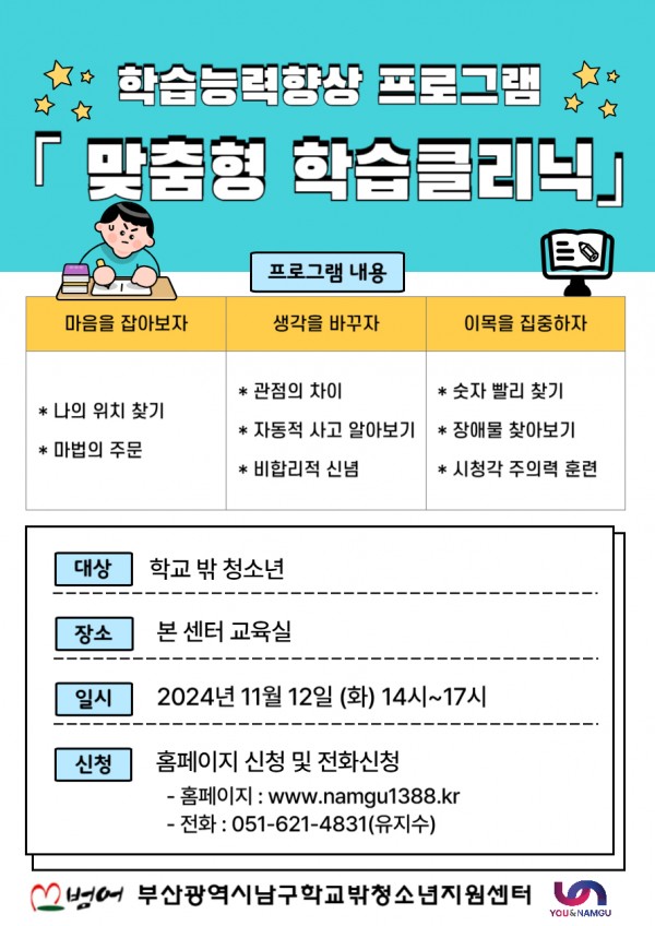 남구학교밖청소년지원센터 '맞춤형학습클리닉' 참여 청소년 모집