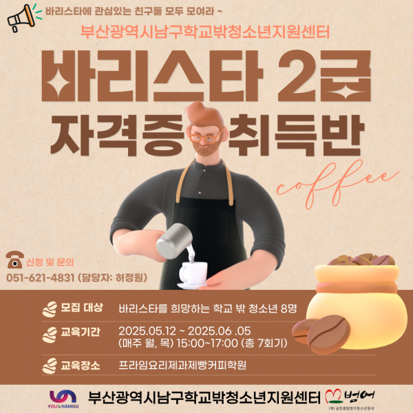 남구학교밖청소년지원센터 자격증취득반(바리스타 2급) 참여 청소년 모집
