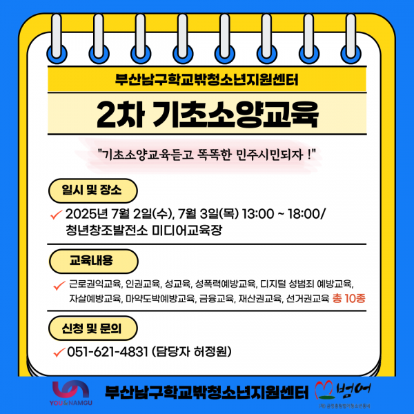 남구학교밖청소년지원센터 2차 기초소양교육 참여 청소년 모집