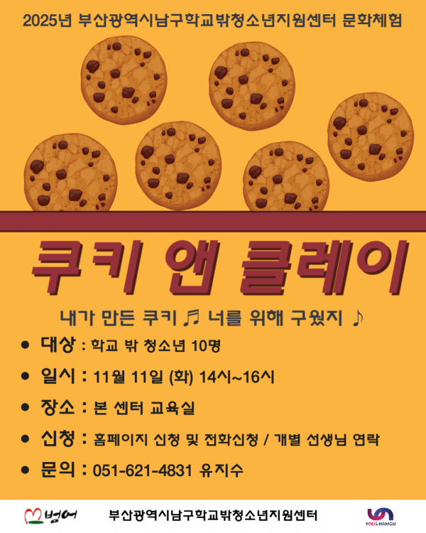 학교밖청소년 지원센터 문화체험 프로그램 '쿠키앤클레이' 참여 청소년 모집