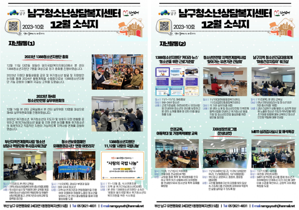 12월 소식지 페이지 정보 작성자 최고관리자 작성일24-01-02 10:57 조회149회 댓글0건 이전글 다음글 답변 목록 본문 남구청소년상담복지센터·남구학교밖청소년지원센터 12월 소식입니다:) 댓글목록 등록된 댓글이 없습니다. 이전글 다음글 답변 목록