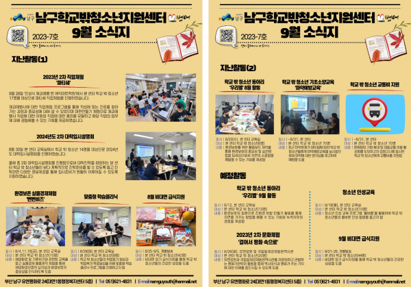 9월 소식지 페이지 정보 작성자 최고관리자 작성일23-09-14 16:47 조회161회 댓글0건 이전글 다음글 답변 목록 본문 남구청소년상담복지센터·남구학교밖청소년지원센터 9월 소식입니다:) 댓글목록 등록된 댓글이 없습니다. 이전글 다음글 답변 목록
