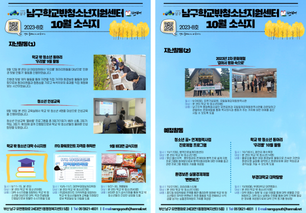 10월 소식지 페이지 정보 작성자 최고관리자 작성일23-10-18 16:39 조회129회 댓글0건 이전글 다음글 답변 목록 본문 남구청소년상담복지센터·남구학교밖청소년지원센터 10월 소식입니다:) 댓글목록 등록된 댓글이 없습니다. 이전글 다음글 답변 목록