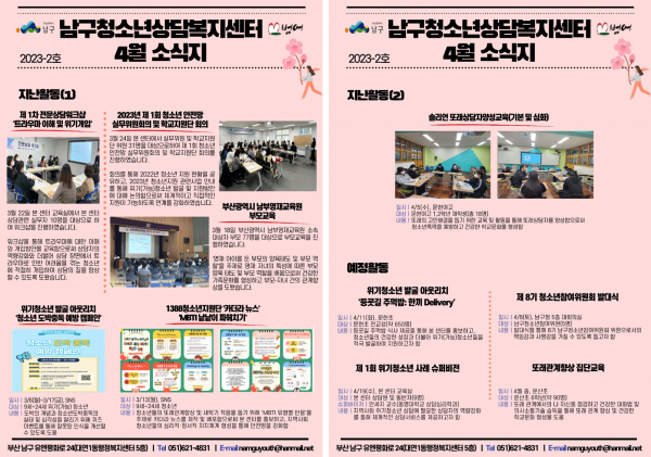 4월 소식지 페이지 정보 작성자 최고관리자 작성일23-04-10 14:48 조회356회 댓글0건 이전글 다음글 답변 목록 본문 남구청소년상담복지센터·남구학교밖청소년지원센터 4월 소식입니다:) 댓글목록 등록된 댓글이 없습니다. 이전글 다음글 답변 목록
