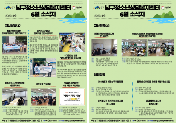 6월 소식지 페이지 정보 작성자 최고관리자 작성일23-06-14 19:43 조회290회 댓글0건 이전글 다음글 답변 목록 본문 남구청소년상담복지센터·남구학교밖청소년지원센터 6월 소식입니다:) 댓글목록 등록된 댓글이 없습니다. 이전글 다음글 답변 목록