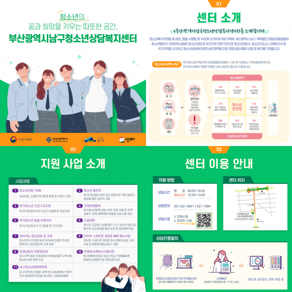 남구청소년상담복지센터·남구학교밖청소년지원센터 소개 및 이용안내 페이지 정보 작성자 최고관리자 작성일23-02-15 09:26 조회881회 댓글0건 이전글 다음글 답변 목록 본문 부산광역시남구청소년상담복지센터·남구청소년지원센터 소개 및 이용안내 카드뉴스입니다. 댓글목록 등록된 댓글이 없습니다. 이전글 다음글 답변 목록