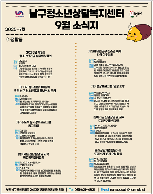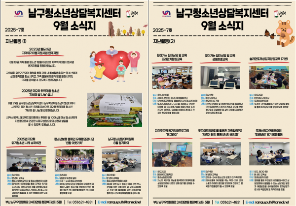 9월 소식지 페이지 정보 작성자 최고관리자 작성일25-09-15 15:03 조회35회 댓글0건 이전글 다음글 답변 목록 본문 남구청소년상담복지센터·남구학교밖청소년지원센터 9월 소식입니다 ! 댓글목록 등록된 댓글이 없습니다. 이전글 다음글 답변 목록