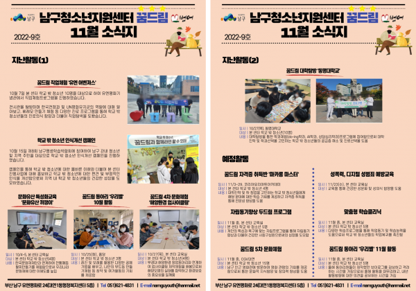 11월 소식지 페이지 정보 작성자 최고관리자 작성일22-11-15 17:59 조회673회 댓글0건 이전글 다음글 답변 목록 본문 남구청소년상담복지센터·남구꿈드림 11월 소식입니다:) 댓글목록 등록된 댓글이 없습니다. 이전글 다음글 답변 목록