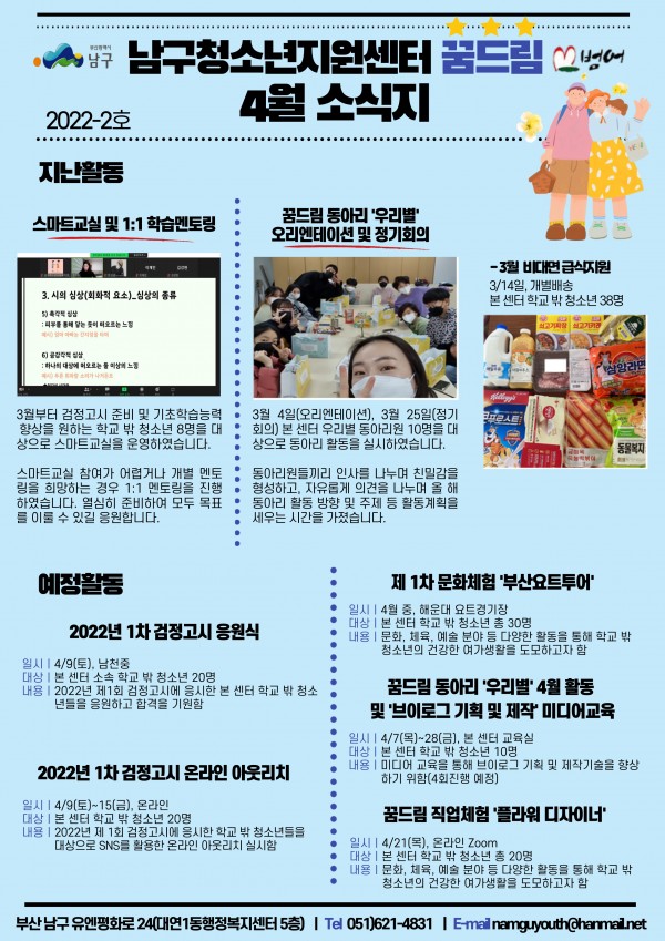 4월 소식지 페이지 정보 작성자 최고관리자 작성일22-04-19 11:37 조회961회 댓글0건 이전글 다음글 답변 목록 본문 남구청소년상담복지센터·남구꿈드림 4월 소식입니다:) 댓글목록 등록된 댓글이 없습니다. 이전글 다음글 답변 목록