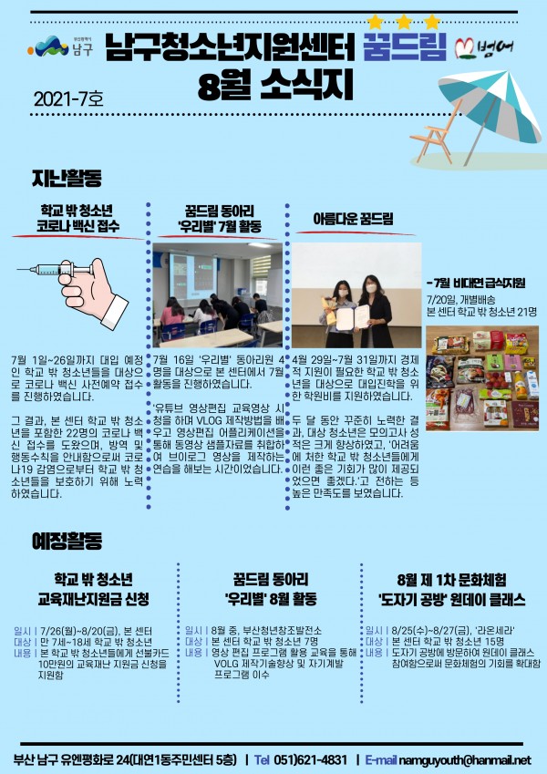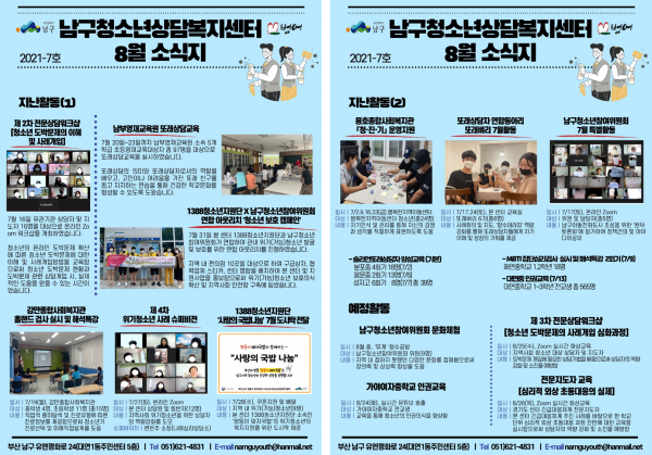 8월 소식지 페이지 정보 작성자 최고관리자 작성일21-08-10 09:11 조회1,758회 댓글0건 이전글 다음글 답변 목록 본문 남구청소년상담복지센터, 꿈드림 8월소식입니다~^^ 댓글목록 등록된 댓글이 없습니다. 이전글 다음글 답변 목록