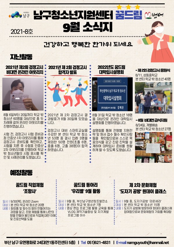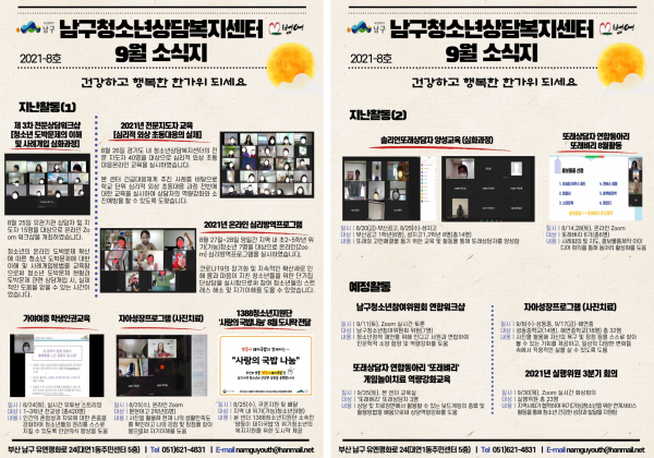 9월 소식지 페이지 정보 작성자 최고관리자 작성일21-09-08 15:23 조회1,451회 댓글0건 이전글 다음글 답변 목록 본문 남구청소년상담복지센터·남구꿈드림 9월소식입니다:) 댓글목록 등록된 댓글이 없습니다. 이전글 다음글 답변 목록
