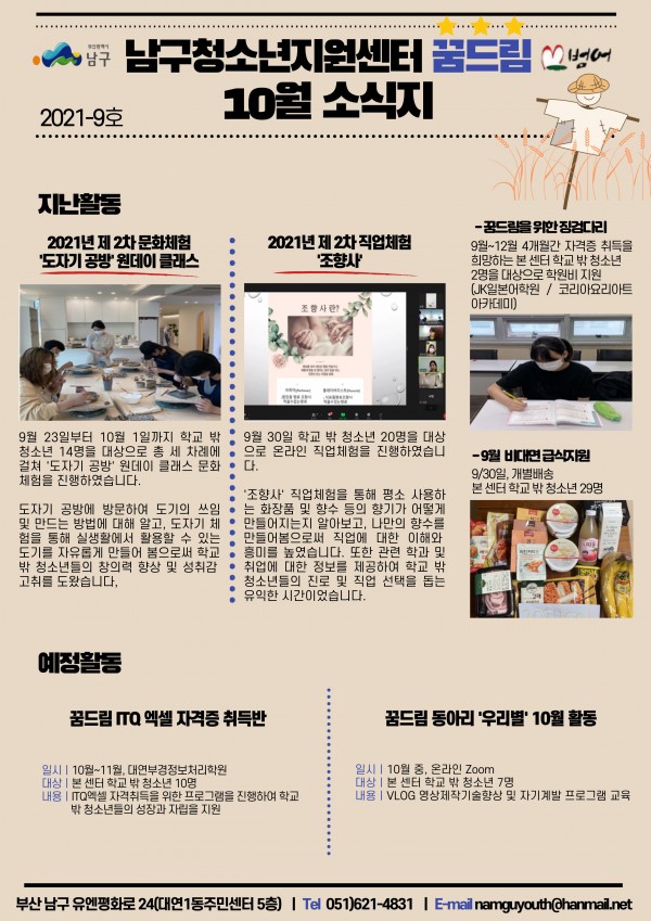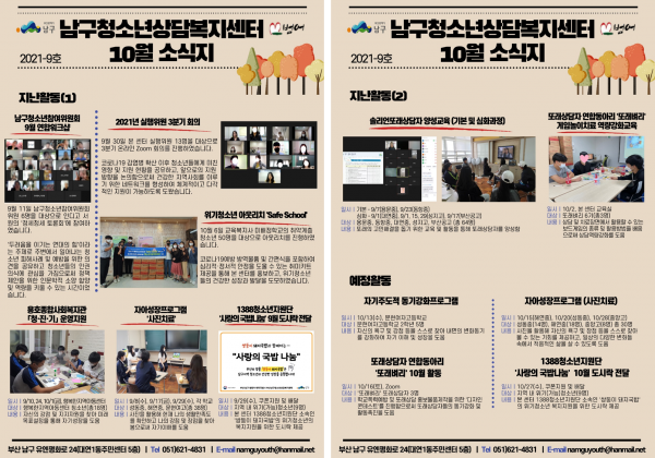 10월 소식지 페이지 정보 작성자 최고관리자 작성일21-10-12 09:32 조회1,408회 댓글0건 이전글 다음글 답변 목록 본문 남구청소년상담복지센터·남구꿈드림 10월소식입니다:) 댓글목록 등록된 댓글이 없습니다. 이전글 다음글 답변 목록