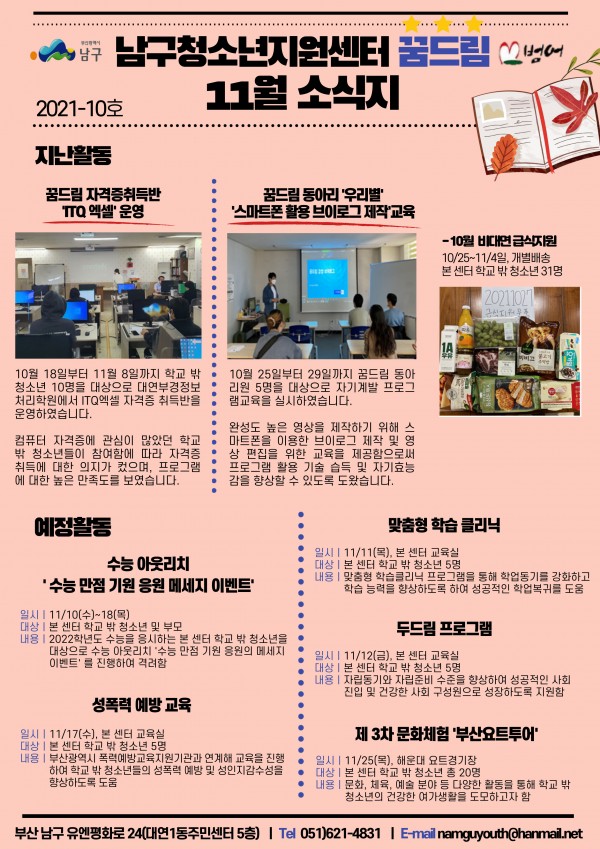11월 소식지 페이지 정보 작성자 최고관리자 작성일21-11-12 09:13 조회1,321회 댓글0건 이전글 다음글 답변 목록 본문 남구청소년상담복지센터·남구꿈드림 11월소식입니다:) 댓글목록 등록된 댓글이 없습니다. 이전글 다음글 답변 목록