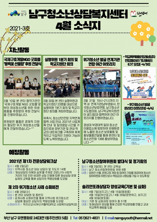 2021년 4월 소식지 페이지 정보 작성자 최고관리자 작성일21-04-09 09:12 조회1,962회 댓글0건 이전글 다음글 답변 목록 본문 남구청소년상담복지센터, 꿈드림 4월소식입니다~^^ 댓글목록 등록된 댓글이 없습니다. 이전글 다음글 답변 목록