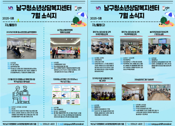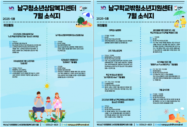 7월 소식지 페이지 정보 작성자 최고관리자 작성일25-07-04 11:40 조회57회 댓글0건 이전글 다음글 답변 목록 본문 남구청소년상담복지센터·남구학교밖청소년지원센터 7월 소식입니다 ! 댓글목록 등록된 댓글이 없습니다. 이전글 다음글 답변 목록