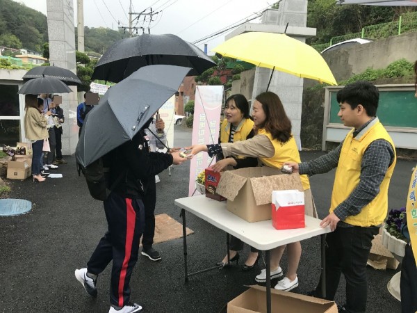 등교시간에 맞춰 찾아가는 아웃리치로 청소년의 건강한 아침을 위한 주먹밥을 배부함.