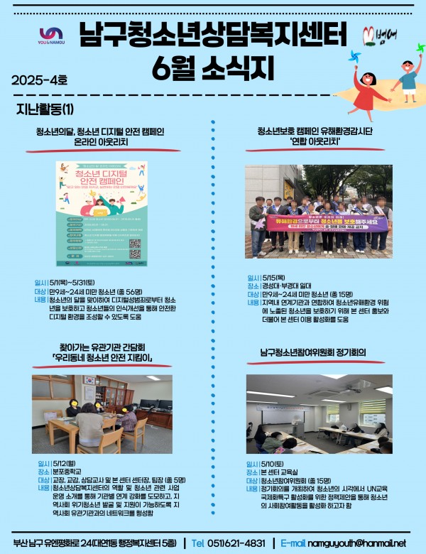 6월 소식지 페이지 정보 작성자 최고관리자 작성일25-06-17 10:26 조회42회 댓글0건 이전글 다음글 답변 목록 본문 남구청소년상담복지센터·남구학교밖청소년지원센터 6월 소식입니다 ! 댓글목록 등록된 댓글이 없습니다. 이전글 다음글 답변 목록