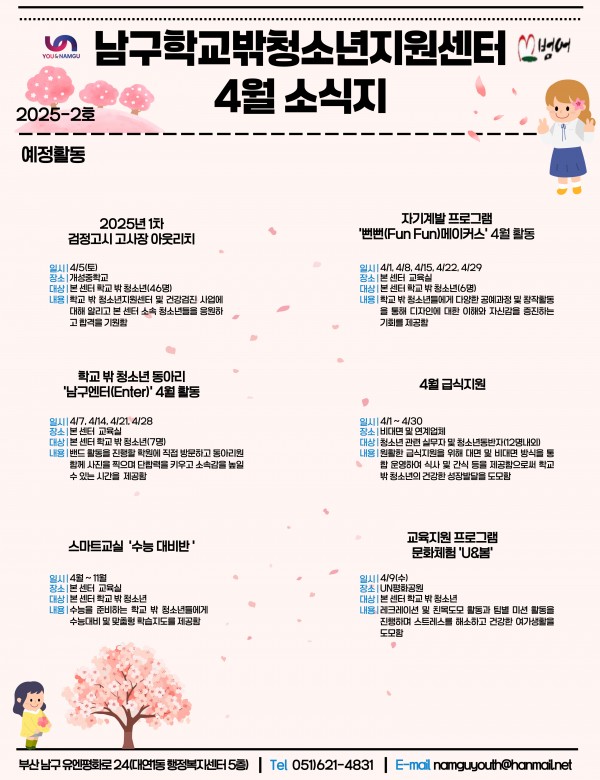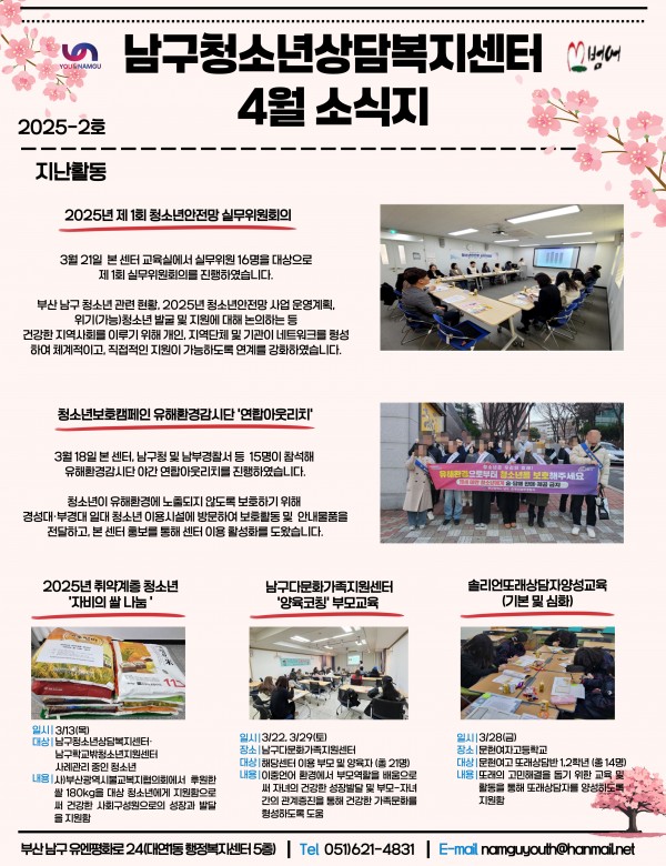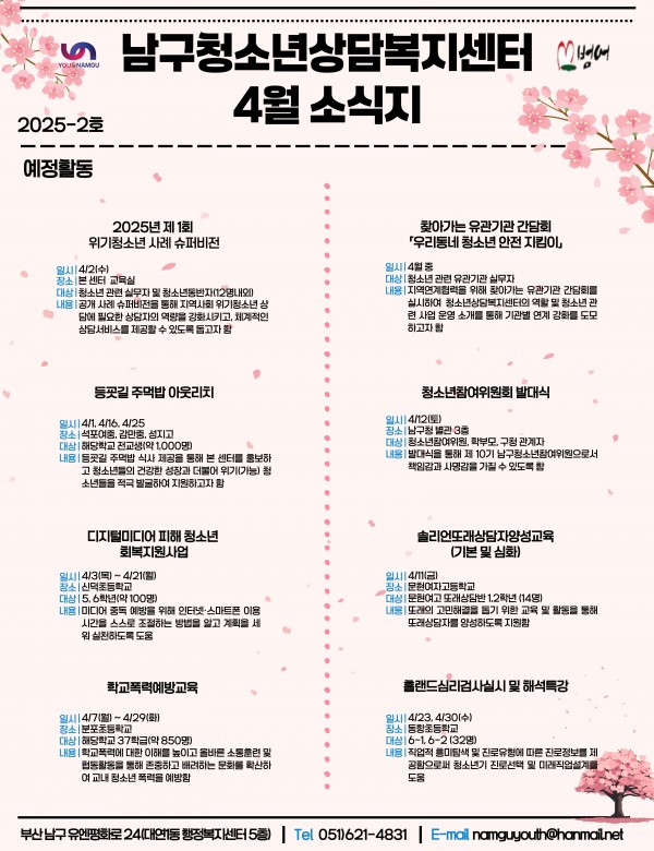 4월 소식지 페이지 정보 작성자 최고관리자 작성일25-04-14 14:13 조회47회 댓글0건 이전글 다음글 답변 목록 본문 남구청소년상담복지센터·남구학교밖청소년지원센터 4월 소식입니다:) 댓글목록 등록된 댓글이 없습니다. 이전글 다음글 답변 목록