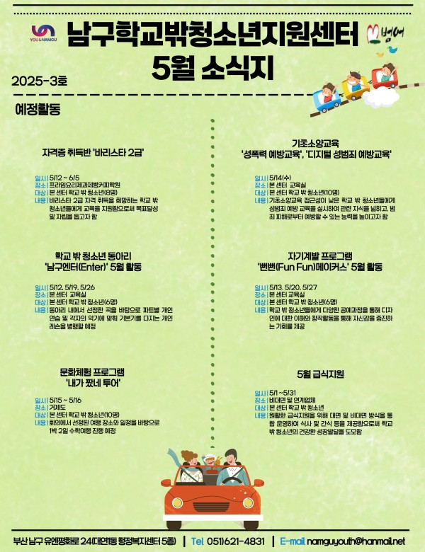5월 소식 페이지 정보 작성자 최고관리자 작성일25-05-13 15:58 조회62회 댓글0건 이전글 다음글 답변 목록 본문 남구청소년상담복지센터·남구학교밖청소년지원센터 5월 소식입니다 ! :) 댓글목록 등록된 댓글이 없습니다. 이전글 다음글 답변 목록