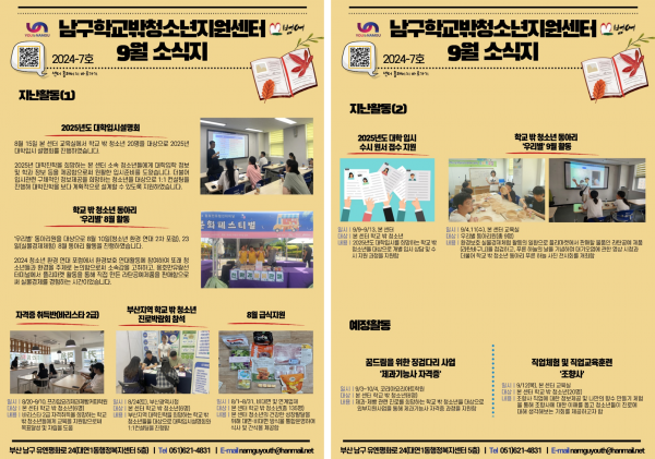 9월 소식지 페이지 정보 작성자 최고관리자 작성일24-09-11 18:57 조회136회 댓글0건 이전글 다음글 답변 목록 본문 남구청소년상담복지센터·남구학교밖청소년지원센터 9월 소식입니다:) 댓글목록 등록된 댓글이 없습니다. 이전글 다음글 답변 목록